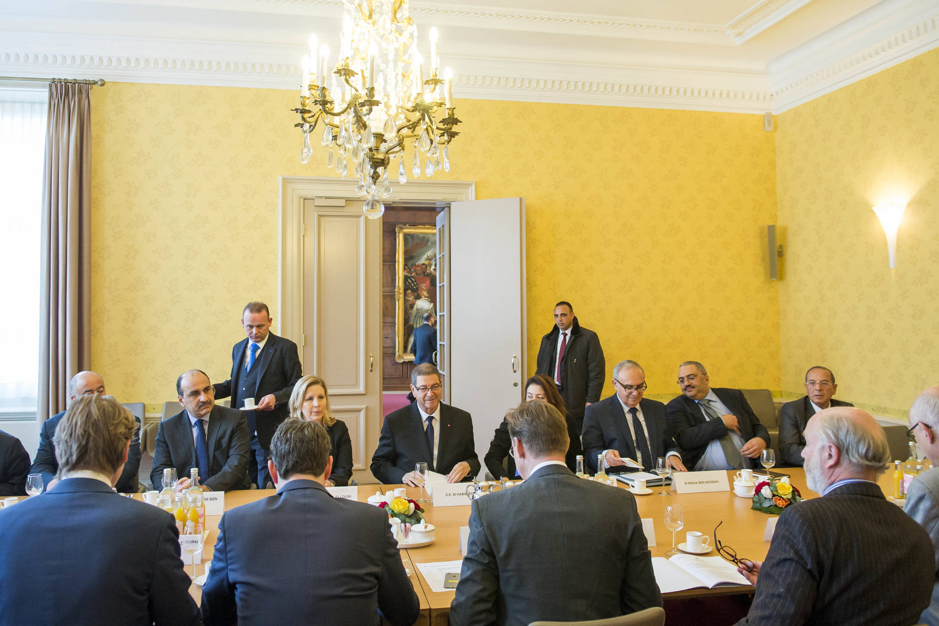 De Voorzitter van de Tweede Kamer, Khadija Arib, en de Ondervoorzitter van de Eerste Kamer, Joris Backer, hebben donderdag in de Stadhouderskamer van de Tweede Kamer de minister-president van Tunesië, Habib Essid, ontvangen. Daarbij waren ook Sonia M'Barek, minister van Cultuur, en Salma Elloumi Rekik, minister van Toerisme en Nijverheid van Tunesië, aanwezig.