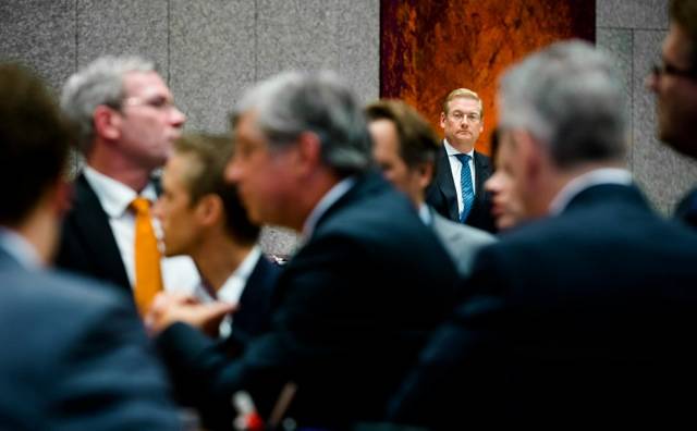 -Minister Ard van der Steur scherp in beeld op de achtergrond van een kluwen Tweede Kamerleden (Bart Maat)